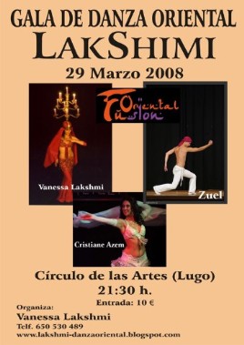 El sábado 29 de marzo se celebró en Lugo una Gala de danza oriental organizada por Vanessa Laksmi, en el Círculo de las Artes de Lugo. Vanesa Moreno, sus alumnas de Fusión Oriental y Sergio Martín fueron invitados a formar parte de esta Gala, donde las estrellas invitadas fueron Cristiane Azem y Zuel, que impartieron un curso intensivo durante ese fin de semana.