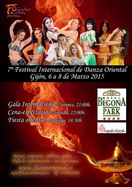Hemos preparado la Séptima Edición del Festival Internacional de Danza Oriental de Gijón. Como siempre, hemos puesto todo nuestro esfuerzo y cariño para que todo salga perfecto. Todas las actividades del Festival se celebraron, un año más, dentro del Hotel Begoña Park****, sede del Festival, uno de los mejores hoteles de la ciudad de Gijón. Este año continuamos teniendo 3 Galas: Internacional, Nacional y Regional, 24 horas de talleres, concurso, cena de gala, fiesta oriental,... y muchas sorpresas!!!
