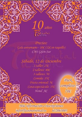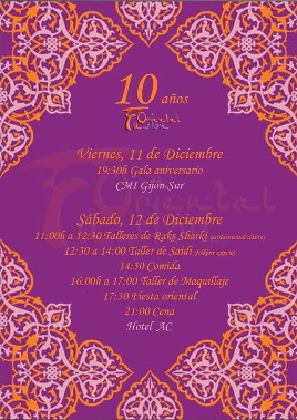 Con mucha satisfacción, estamos organizando la fiesta para conmemorar los 10 años que llevamos trabajando para fomentar la Danza Oriental en el Principado de Asturias. Talleres, Gala de Danza, fiesta oriental, cena-espectáculo,... y muchas sorpresas!!!